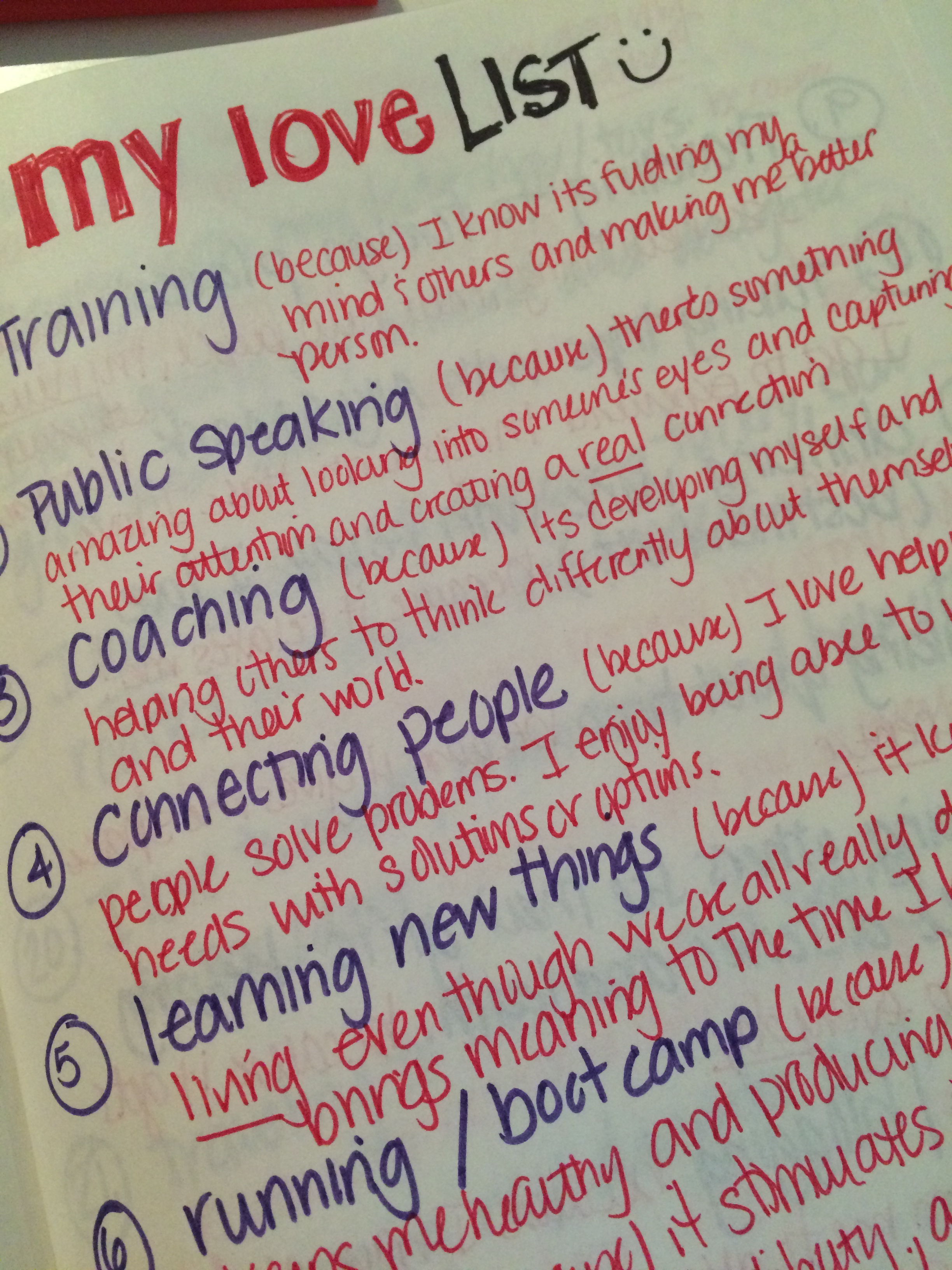 Making a love list was easy for me. After you list what you love you qualify the item by stating why.